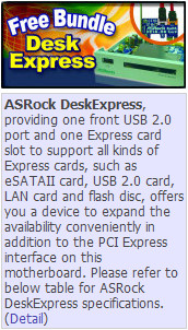 | Accessories | - Quick Installation Guide, Support CD, I/O Shield - Floppy/ATA 133 Cables - 4 x SATA Data Cables (optional) - 1 x SATA 1 to 1 Power Cable (optional) - 1 x HDMI_SPDIF Cable (optional) - 1 x DeskExpress Hot Plug Detection Cable (optional) - 1 x USB Header Data Cable (optional) - 1 x ASRock DeskExpress (optional) - 1 x PCIE_DE Card (optional) - 4 x Screws (optional) |