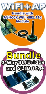 | Accessories | - 1 x ASRock WiFi-802.11g Module - 1 x Antenna - 1 x ASRock SLI Bridge - 1 x ASRock 3-Way SLI Bridge - Quick Installation Guide, Support CD, I/O Shield - Floppy/ATA 133 Cables - 4 x SATA Data Cables - 1 x SATA 1 to 1 Power Cable - 1 x HDMI_SPDIF Cable |